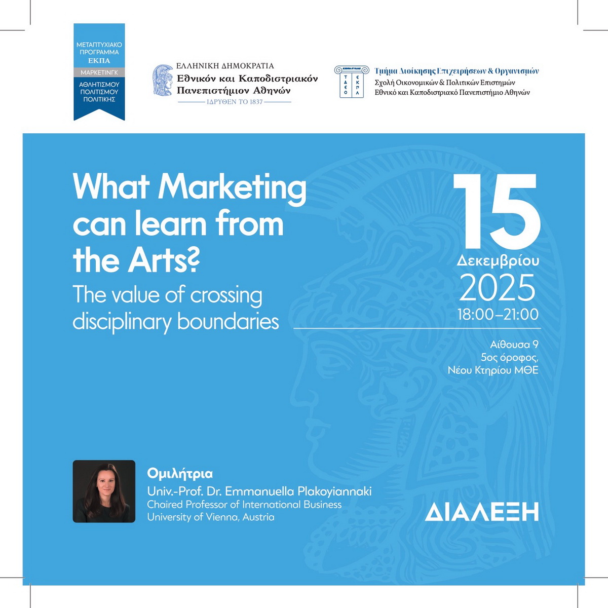 Το ΠΜΣ «Μάρκετινγκ Αθλητισμού, Πολιτισμού, Πολιτικής» του Τμήματος Διοίκησης Επιχειρήσεων & Οργανισμών του ΕΚΠΑ διοργανώνει εκδήλωση με ομιλήτρια την: